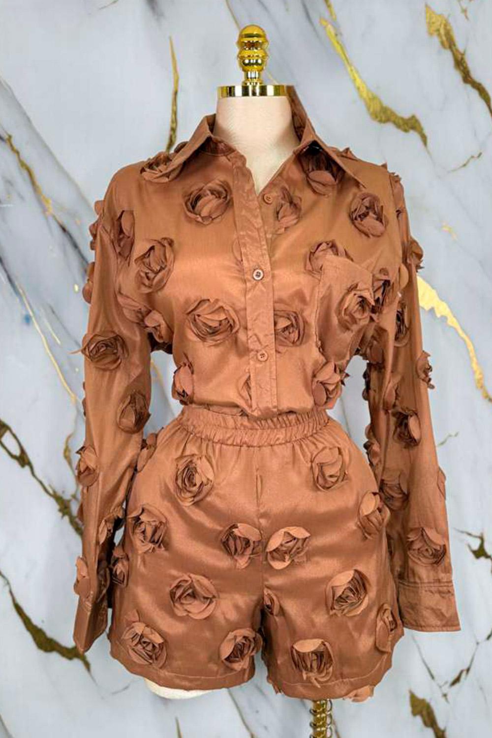 This is a stylish two-piece set featuring a button-down long sleeve top and matching high-waisted shorts in a rich bronze-brown shade. The standout detail is the 3D floral appliqué design, with rose-like fabric blooms sewn throughout, giving the outfit a textured and romantic feel. The blouse has a classic collar with front buttons, while the shorts feature a comfortable elastic waistband for a flattering fit. Perfect for making a bold fashion statement, this set blends elegance with a playful, fashion-forward twist.