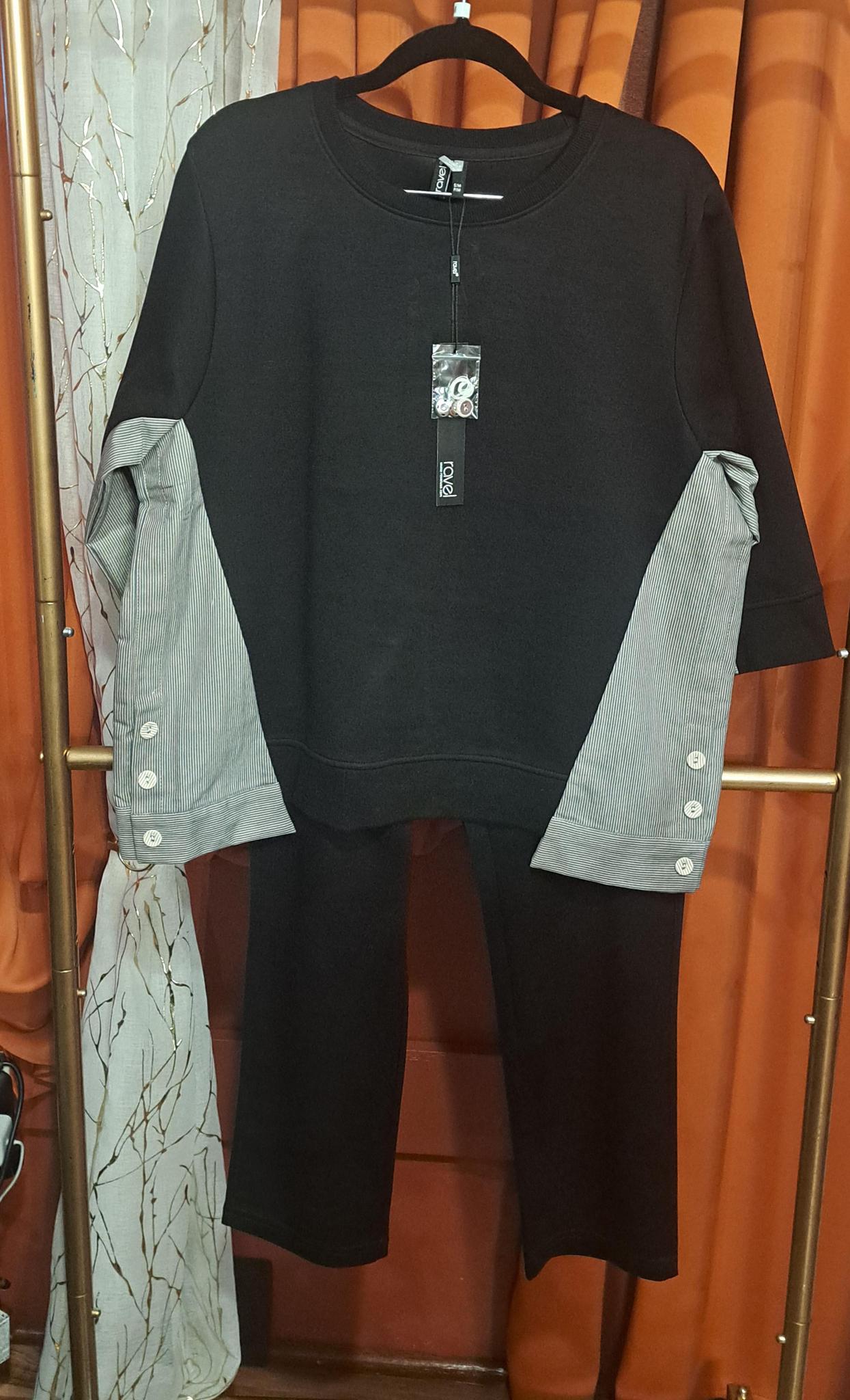 A chic two-piece set that blends comfort with modern edge. The black top features contrast striped sleeves with button detailing, giving the illusion of a layered look without the bulk. Paired with matching black straight-leg pants, this ensemble is effortlessly stylish and versatile—perfect for casual outings, office wear, or a polished everyday look. The mix of solids and stripes adds a touch of sophistication while keeping it relaxed and easy to wear.