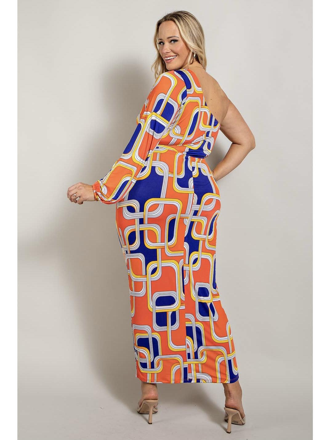 Plus Size One Shoulder Dress with Cutout Detail. Color: Tomato with Royal Blue, Yellow, and White Detail.