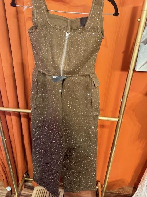 Embellished Denim 2 Piece Cargo Pants Set Brown