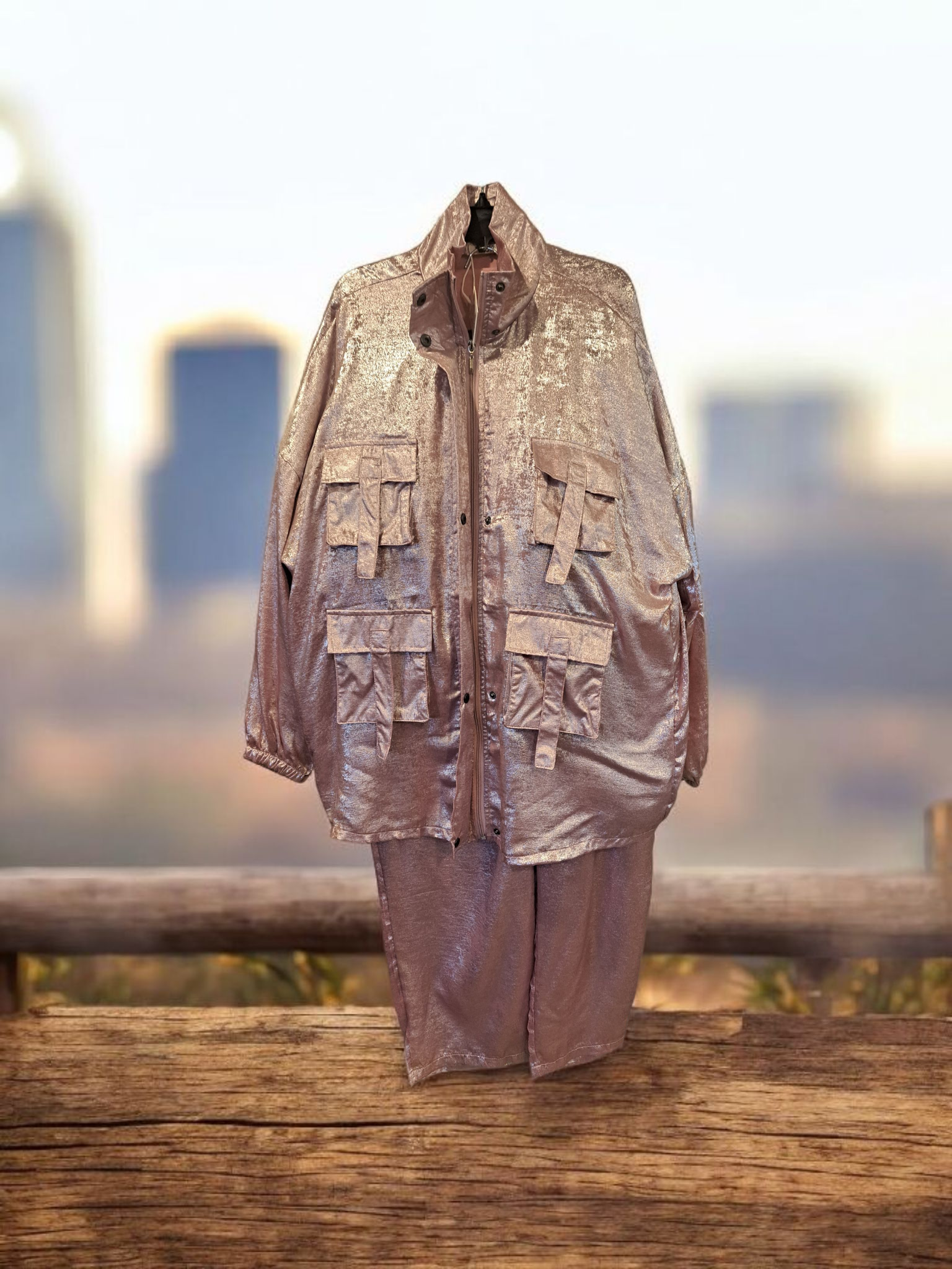 A forward-engineered ensemble built for the modern frontier. The NOVA- 9 SET combines tactical design with minimalist futurism—crafted in a deep matte pink with a subtle metallic sheen. The jacket features multi-dimensional cargo pockets, precision zippers, and a high-collar silhouette that adapts from function to form. Paired with streamlined trousers, the set embodies urban stealth, motion efficiency, and post-digital resilience. Designed for those who move between shadows and skylines.