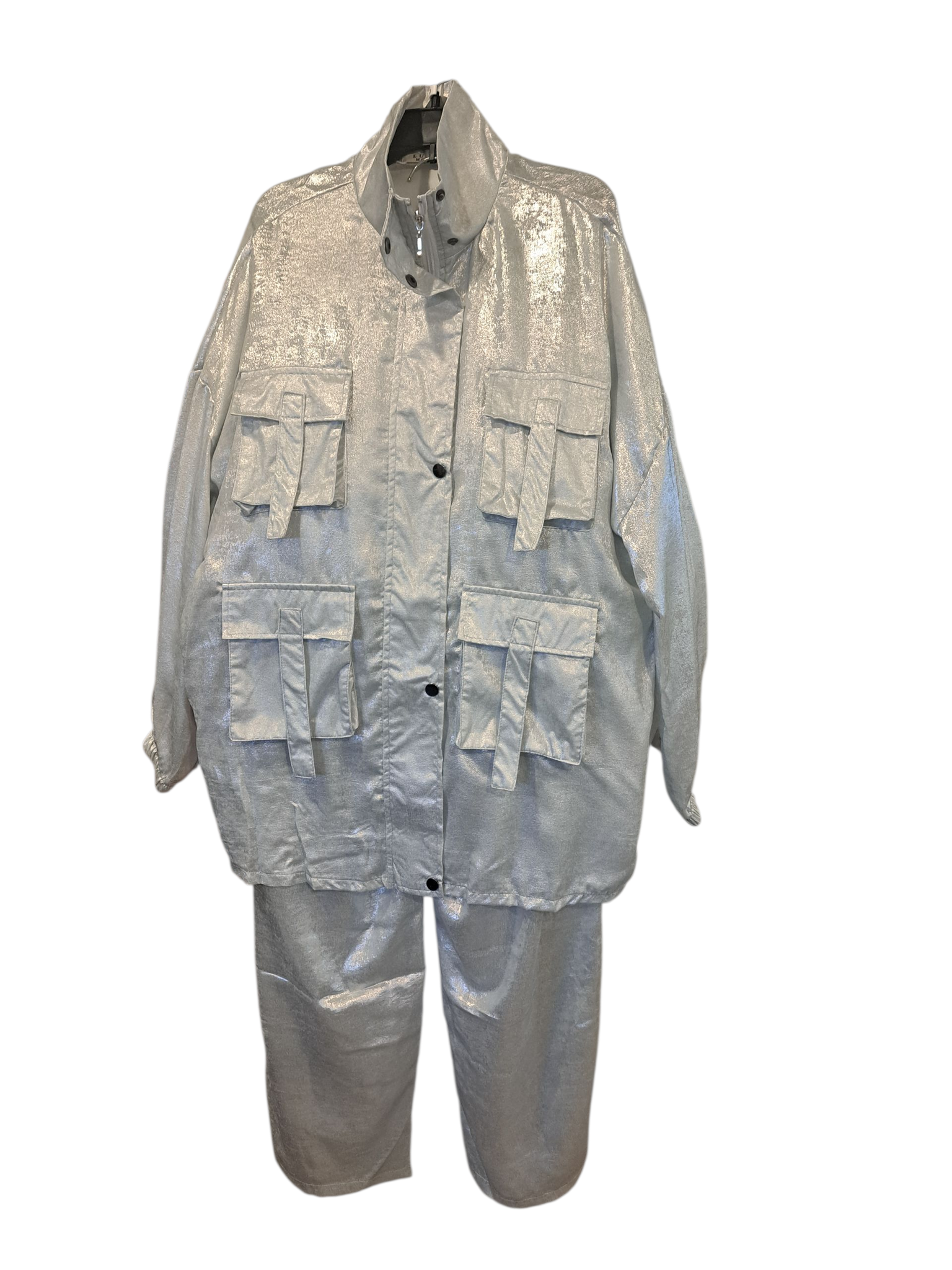A forward-engineered ensemble built for the modern frontier. The OVA 9 SET combines tactical design with minimalist futurism—crafted in a deep matte SILVER with a subtle metallic sheen. The jacket features multi-dimensional cargo pockets, precision zippers, and a high-collar silhouette that adapts from function to form. Paired with streamlined trousers, the set embodies urban stealth, motion efficiency, and post-digital resilience. Designed for those who move between shadows and skylines.