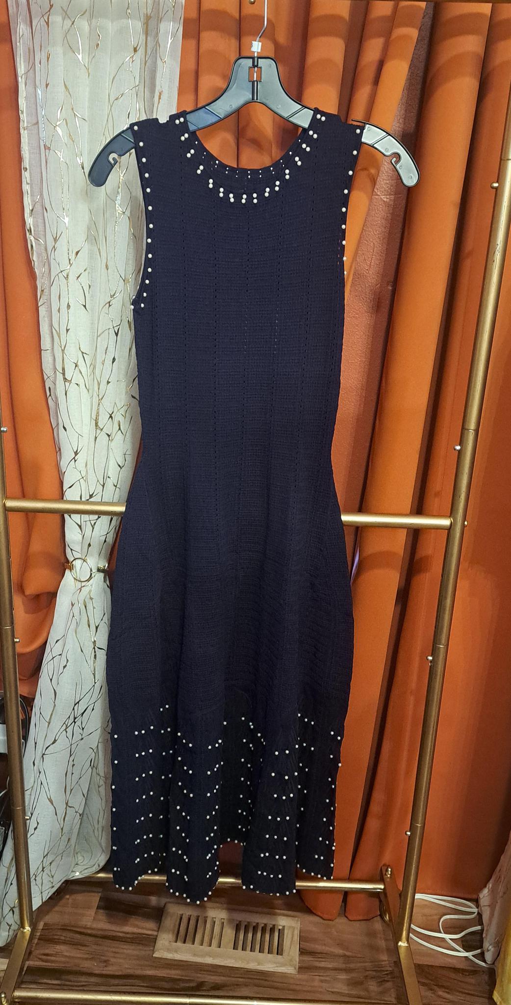 This dress is a stunning blend of elegance and sophistication. Crafted in a deep navy hue, it features a sleeveless, fitted bodice that flows gracefully into a flared hemline. The textured knit fabric gives it a refined, structured look, while the pearl embellishments add a touch of timeless glamour. Pearls line the neckline and armholes delicately, cascading more densely at the bottom hem, creating a chic gradient effect. Perfect for evening events, cocktail parties, or special occasions, this piece strikes the perfect balance between classic and modern style.