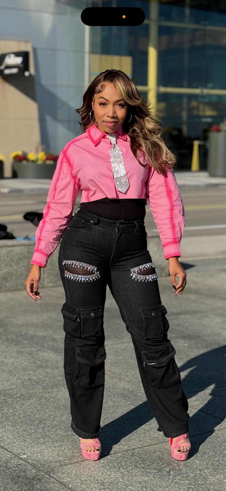 Spray Painted Design Button Up Closure Cropped Length Detachable Jewel Neck Tie Long Sleeve Model Is 5' 8" And Wears Size Med.