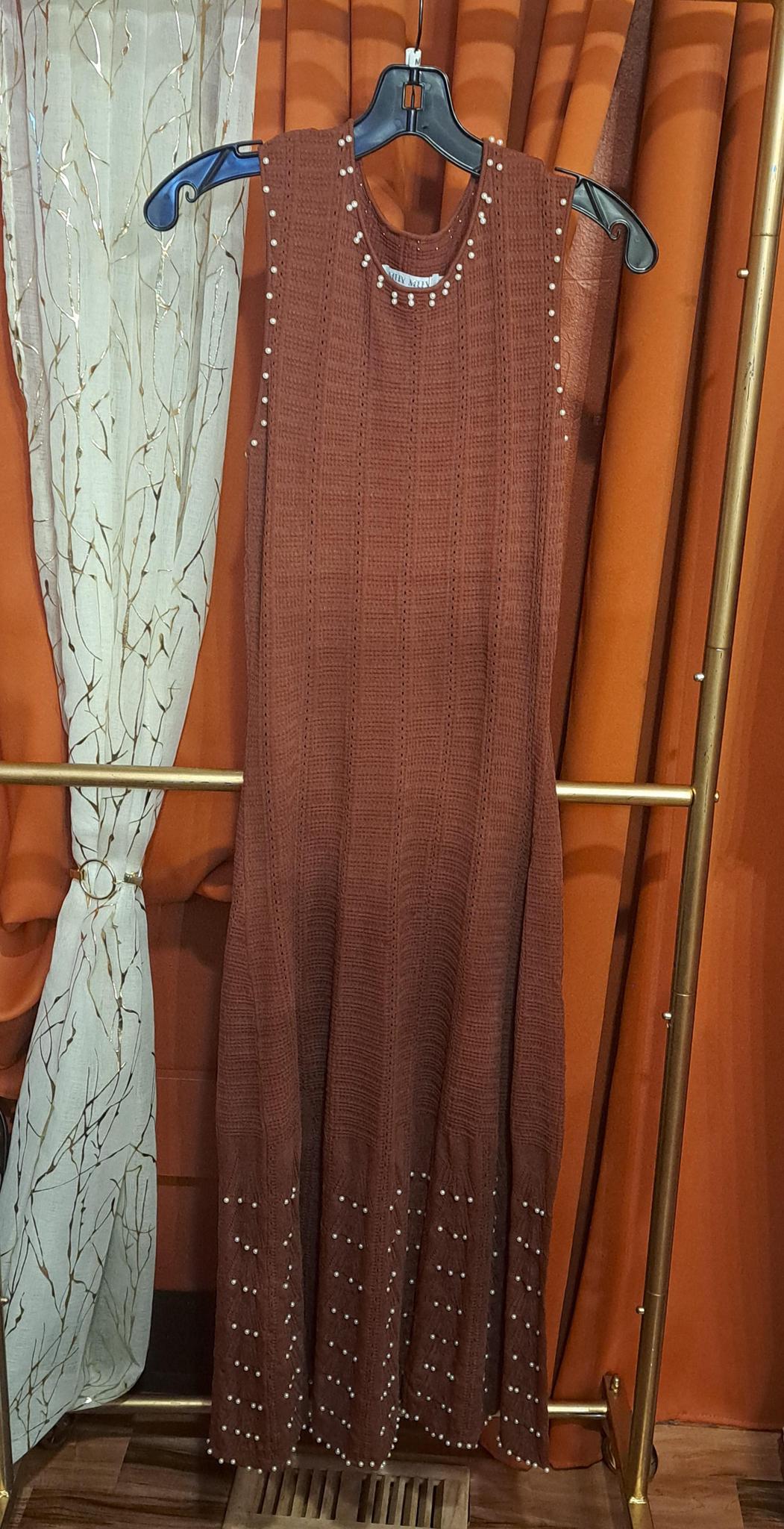 This is a sleeveless, rust-colored knit dress designed with a flattering midi length. The fabric has a textured, ribbed pattern that gives it structure and sophistication. Delicate pearl embellishments line the neckline, armholes, and cascade toward the hem, adding a touch of elegance and sparkle. The pearls at the bottom are arranged in a scattered yet graceful pattern, creating a chic contrast against the warm earthy tone of the dress. Perfect for evening outings, fall gatherings, or occasions where cozy meets classy.