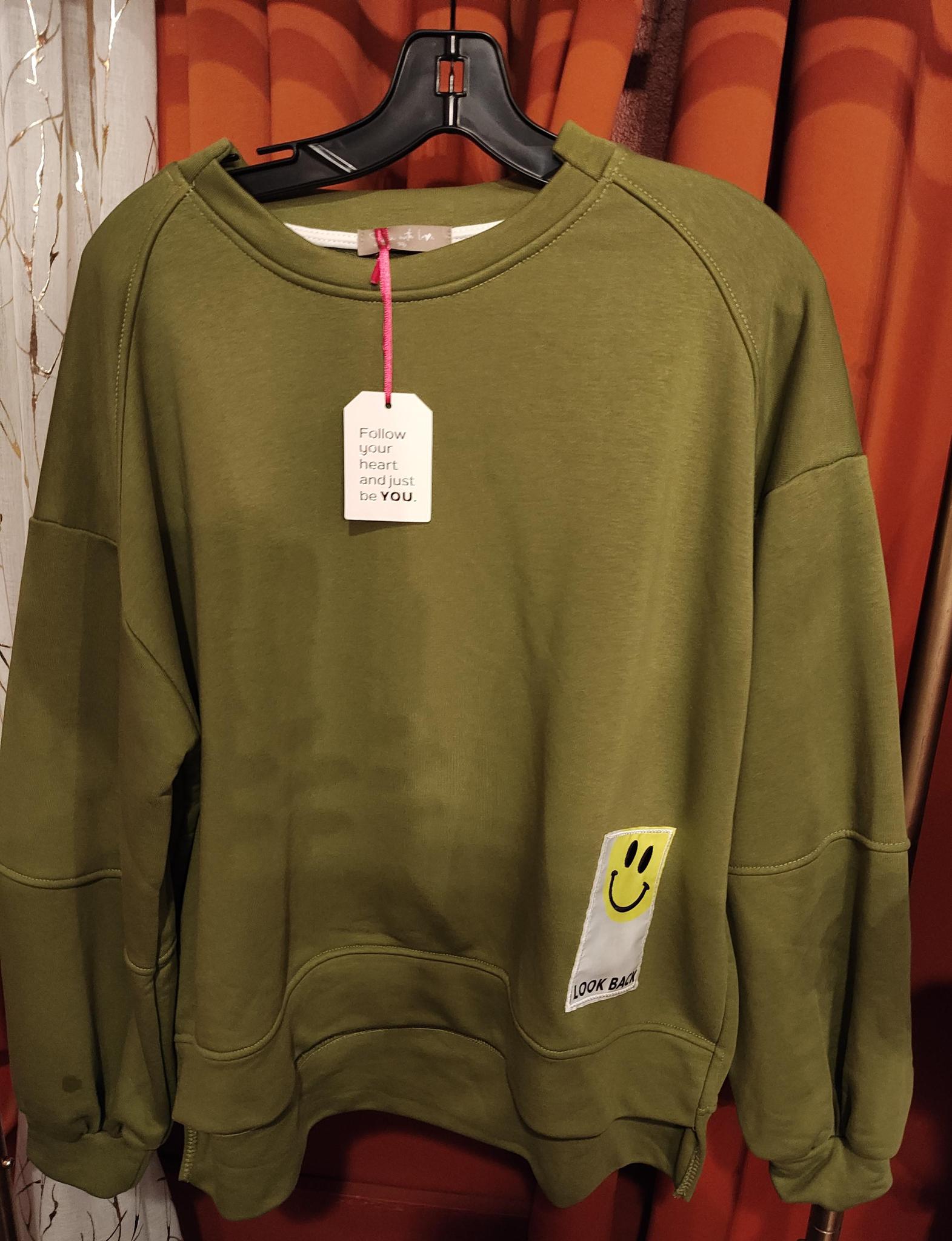 Stay cozy and cheerful in this olive green sweatshirt, designed with a relaxed fit and casual crew neckline. Featuring a bold smiley face patch with the words “LOOK BACK” for a playful twist, this piece brings positive vibes to your everyday style. The soft fabric and ribbed cuffs add comfort, while the laid-back silhouette makes it perfect for layering or wearing solo. A feel-good essential that keeps you warm and smiling all day.