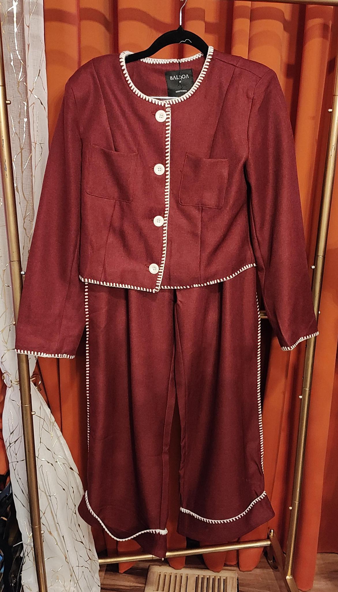 This sophisticated two-piece set in deep burgundy features a tailored jacket with bold white button closures and contrast trim for a chic finish. The matching wide-leg pants flow effortlessly, adding comfort and elegance to the look. With its classic round neckline, front pockets, and detailed edging, this ensemble blends timeless charm with modern flair—perfect for both day-to-evening wear.