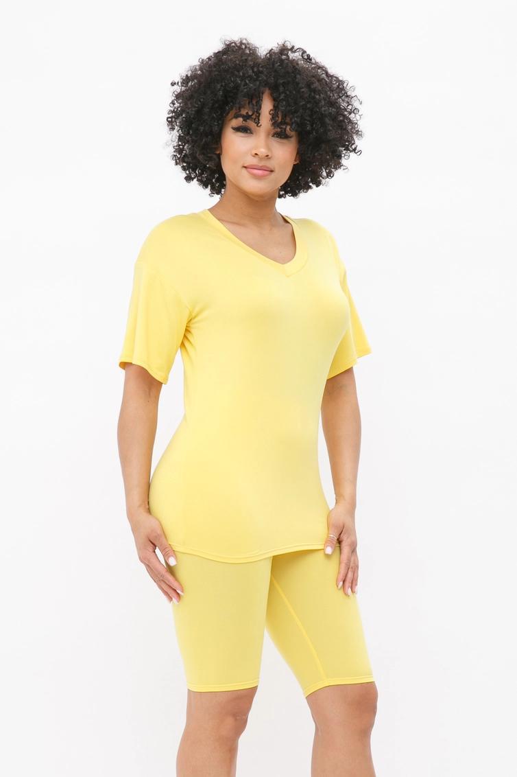 Brushed Dty V Neck Basic T-Shirts Top and Bike Shorts Set